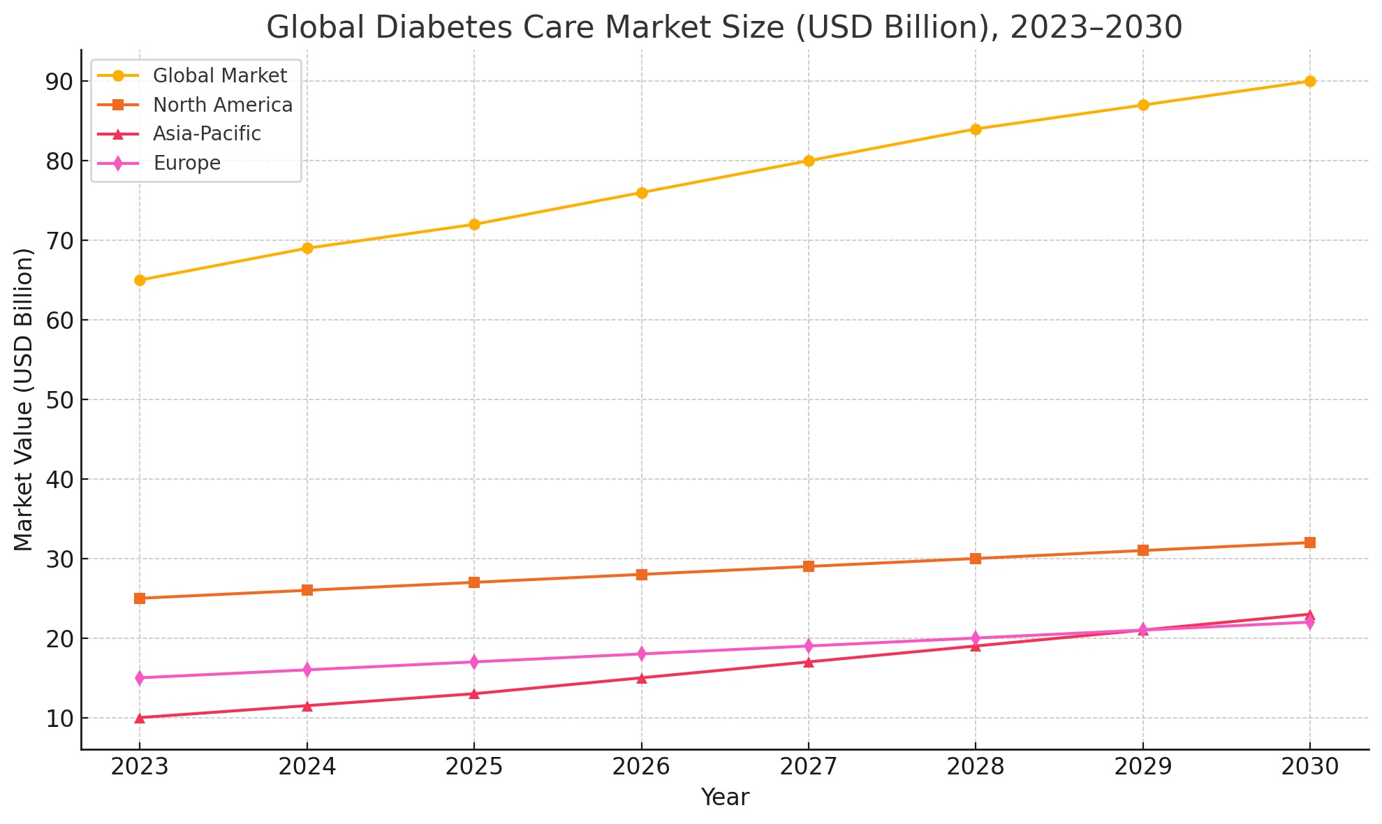 The global diabetes market is witnessing robust growth due to the rising prevalence of the disease, advancements in technology, and increased healthcare spending. As of 2024, over 537 million adults are living with diabetes, and this number is projected to reach 643 million by 2030, according to the International Diabetes Federation (IDF). This surge has fueled demand for diagnostic tools, insulin delivery devices, medications, and digital health platforms. The global diabetes care market was valued at USD 65 billion in 2023, and it is expected to surpass USD 90 billion by 2030, growing at a CAGR of 5.8%. North America remains the dominant market due to high awareness, advanced healthcare infrastructure, and strong insurance systems. However, the Asia-Pacific region is emerging as the fastest-growing market, driven by increasing urbanization, sedentary lifestyles, and rising obesity rates.